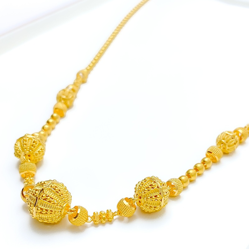This exquisite long necklace, crafted from 22k gold and weighing 30.3 grams, showcases a lustrous yellow gold finish. The piece measures 28 inches in length, plus 1.75 inches of adjustable links for a customized fit, secured with a lobster lock. It features a series of bead orbs that add a touch of grandeur and sophisticated detail, making the necklace both eye-catching and elegant. Ideal for those who appreciate the beauty of detailed beadwork combined with the timeless appeal of gold, this necklace is perfect for enhancing formal attire or adding a luxurious element to a more casual look.