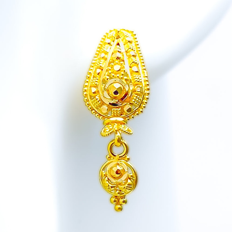 These exquisite 22k yellow gold earrings, weighing 3.9 grams, feature a lustrous finish that enhances their radiant appeal. Designed in a classic tops style, each earring measures 1.2 inches in length and is secured with a screw-back post, ensuring a comfo