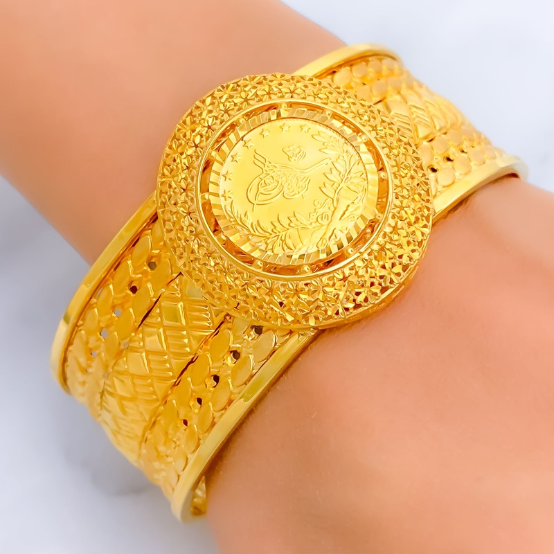 This 21k gold bangle bracelet, weighing 30.9 grams, features a majestic design with a polished yellow gold finish that radiates sophistication. The 2.5-inch diameter, coupled with 1.25-inch adjustable links, ensures a tailored and comfortable fit. Designed