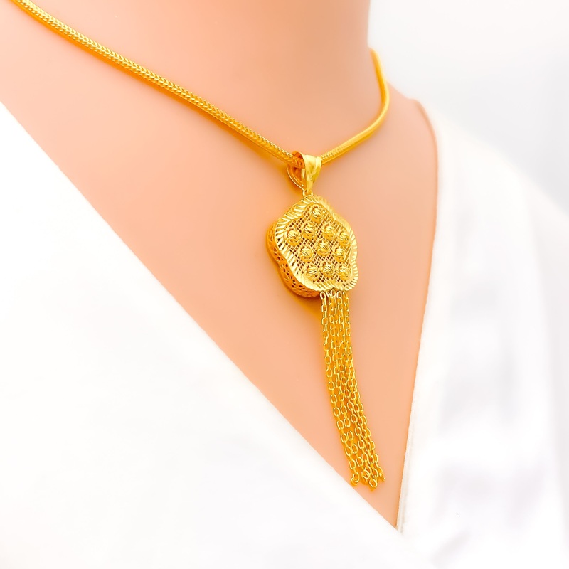 This 22k gold pendant, weighing 5.3 grams, features a majestic glowing flower design that exudes elegance and sophistication. The yellow gold finish enhances its luxurious and radiant appearance. Measuring 2.75 inches in length, this pendant is perfect for adding a touch of refined beauty to any necklace chain (chain not included). Ideal for those who appreciate exquisite craftsmanship and timeless floral motifs, this stunning pendant is a standout addition to any jewelry collection.