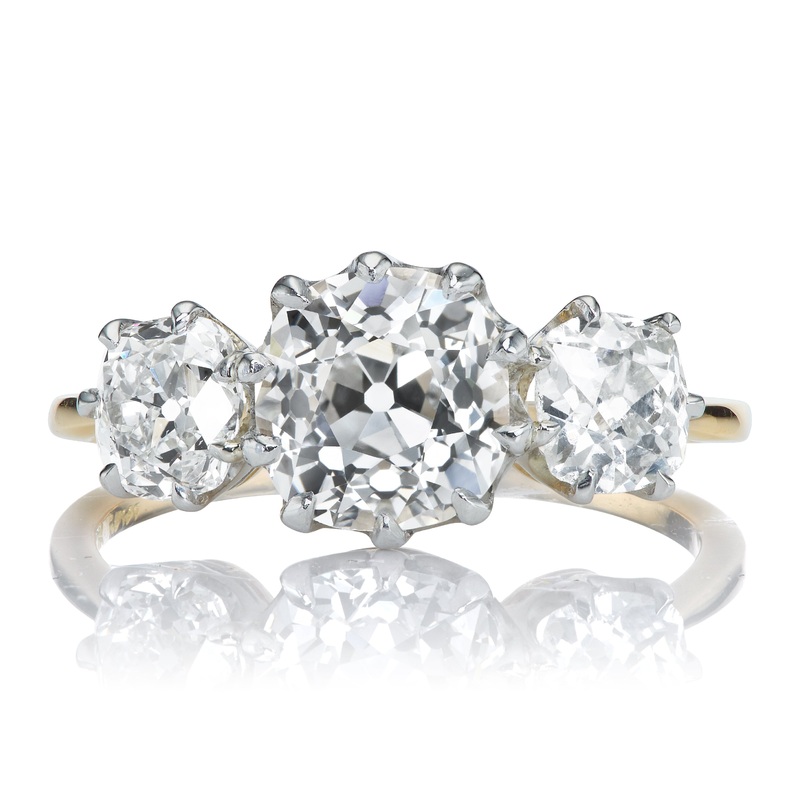 Three Stone Engagement Ring with Bright White Old Mine Cut Diamonds in Two Tone Setting