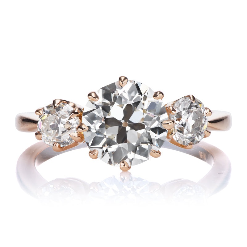 ThreeStone Old European Cut Diamond Ring in 18kt Rose Gold SettingThe Marielle 1.85 ring is an AB original design made right here in NYC. The ring centers a GIA-certified 1.85 carat Old European Cut diamond of K color, VS1 clarity. To each side of the cent