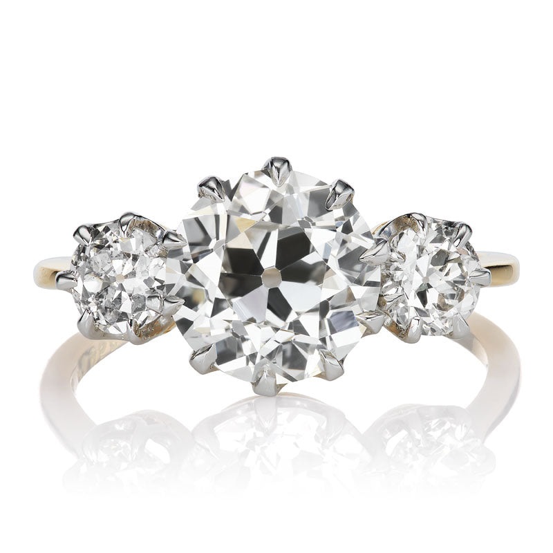 TheMarielle 2.63 ring is an AB original design made right here in NYC. The ring centers a GIA-certified 2.63-carat oldEuropean cut diamond ofI color,VS1 clarity. The stone is set in a10-prong platinum and 18kt yellow goldsetting. An old European cut diamond of coordinating color and clarity is set to either side of the center stone combining for 0.69-carats. The ring is currently size6.25 and can be resized!