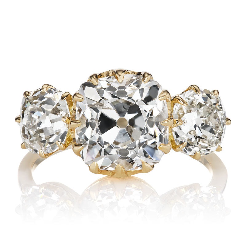 Chunky 3.23ct Old Mine Cut Diamond Three Stone OMC RingTheMarielle 3.23 ring is an AB original design made right here in NYC. The ring centers a GIA-certified 3.23-carat oldmine cut diamond ofK Faint Brown color,I1 clarity. The stone is set in a12-prong 18