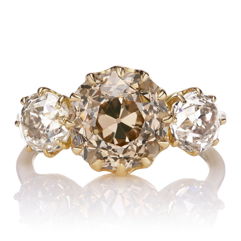 3.70ct Champagne Colored Old European Cut 3 Stone RingTheMarielle 3.70 ring is an AB original design made right here in NYC. The ring centers a GIA-certified 3.70-carat oldEuropean cut diamond ofFancy Light Brown-Yellowcolor,SI2 clarity. The stone is set i