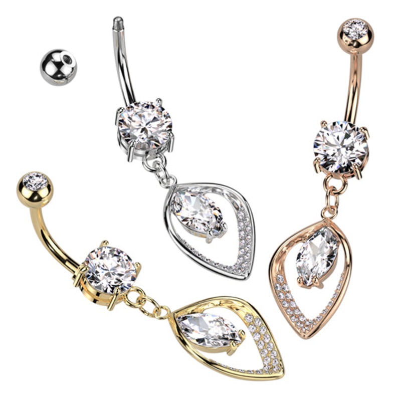 The 14 gauge marquise czbelly dangle is made from 316L stainless steel with external threading. Only the 5mm top ball is removable. Choose your finishbelow.
