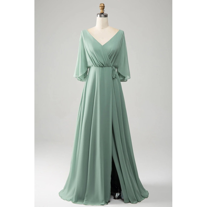 Matcha Batwing Sleeves Long Chiffon Split Bridesmaid Dress