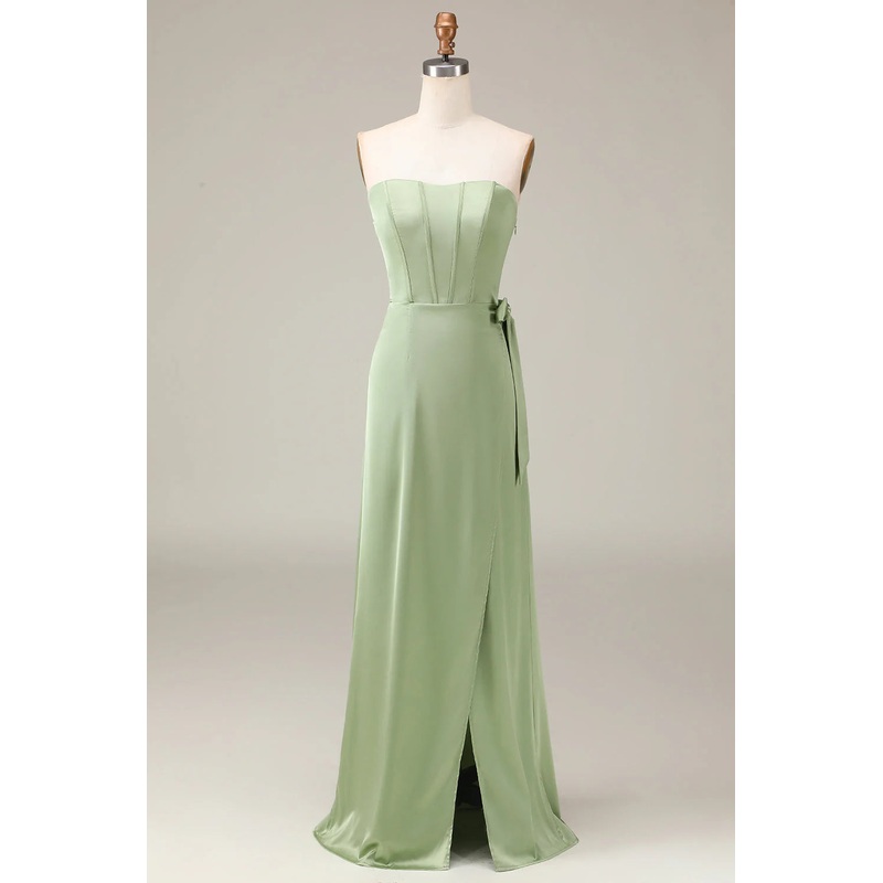 Matcha strapless tight fitting corset with A-line slit satin bridesmaid dress