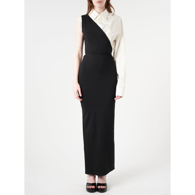 Shaped to a maxi length, MM6s deconstructed, paneled dress is cut from cotton poplin and elastane. The brands discreet yet distinct signature, a horizontal line of white stitches, is found on the back.Point collarAsymmetric shoulderSingle long sleeve with