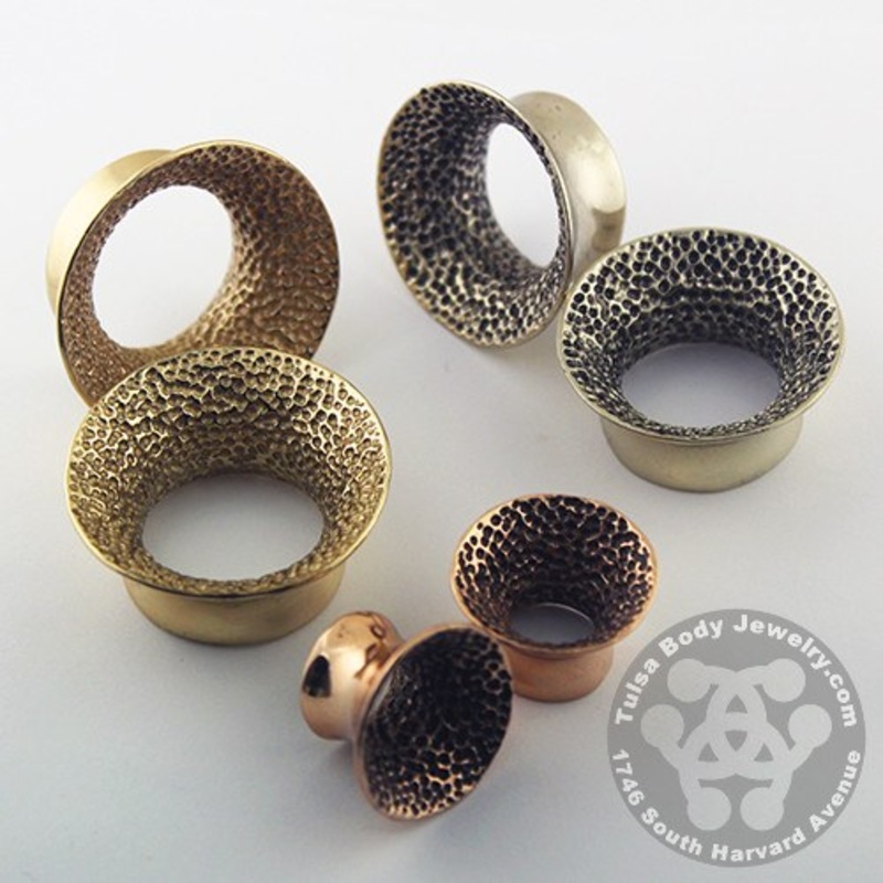 These mayan double flare tunnels have an interior stipple pattern, cast from copper, yellow brass or white brass. These are a unique, low-production item that will be unavailable after we sell out.