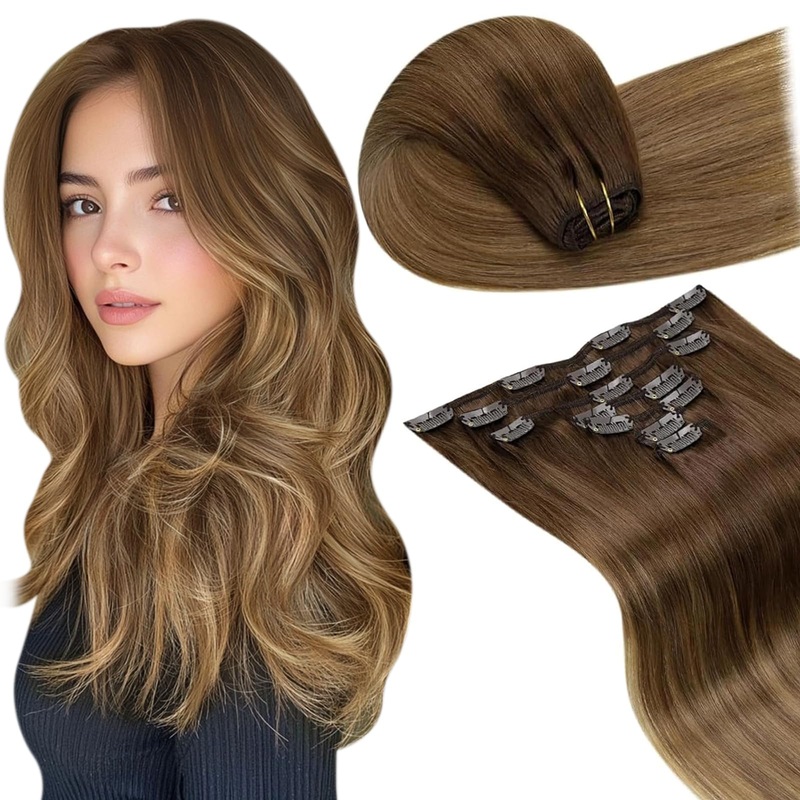 Medium Brown to Light Brown Mix Golden Blonde Balayage Clip in Hair Extensions Human Hair Real Hair Extensions 120g7-Piece Clip-In Human Hair ExtensionsAchieve the perfect fuller look effortlessly with our 7-piece clip-in hair extensions, crafted from 100%