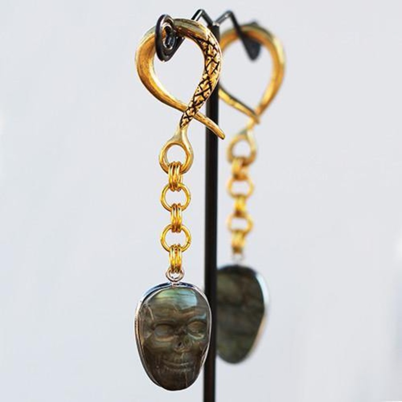 These 6 gauge medium labradorite skulldangleearringsare cast from solidyellowbrass by Oracle Body Jewelry.Dimensions: mm high X mm wideWeight: approximately grams each piece