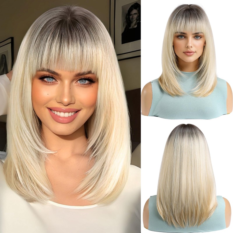 Effortless Glamour: Medium-Length Ombre Blonde Wig with Bangs Chic, Soft & Natural: Elevate your style with this effortlessly stunning ombre blonde wig! Designed to mimic the look and feel of real hair, its silky-smooth strands offer a natural shine and fu