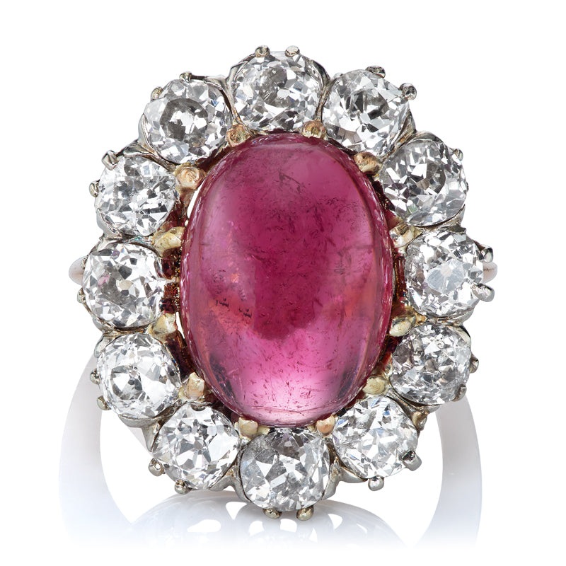 TheMelanie ring is an authentic vintage tourmaline and diamond ring from the Edwardian Era circa 1910. The ring centers a GIA-certified Purplish Pink Cabochon Cut Tourmaline weighing approximately 6-carats. A halo of 12 old mine cut diamonds surround the center stone combining for approximately 2.40-caratsof approximatelyJ-K in color, VS-SI clarity. The stone is set in abeautiful 14kt white and yellow goldsetting. The ring is currently size6.25 and can be resized!