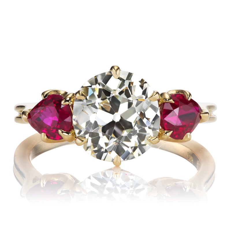 The Melissa 2.15 ring is an AB original design made right here in NYC. The ring centers a GIA-certified 2.15-carat Old European Cut diamond of L color, VS2 clarity. On either side of the center stone is a Pear Cut ruby, together totaling 0.93 carats. The stones are set in our signature 18kt yellow gold. The ring is currently size 5 and can be resized!