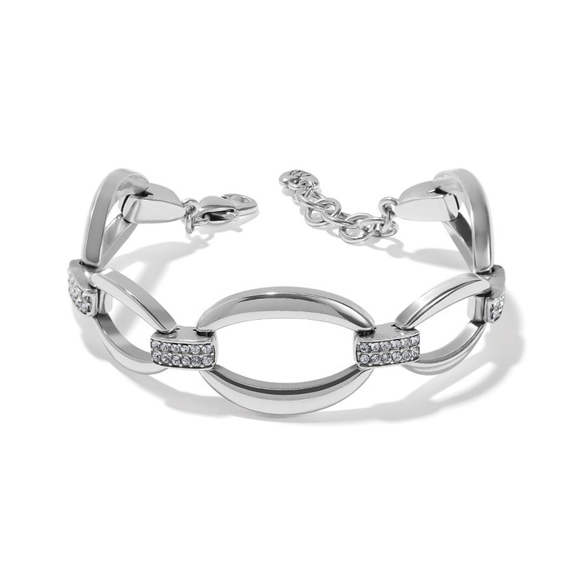 Graphic, bold and shiny links are accented with stations encrusted with fine quality crystals. Each link is curved slightly to encircle the wrist in pure comfort.