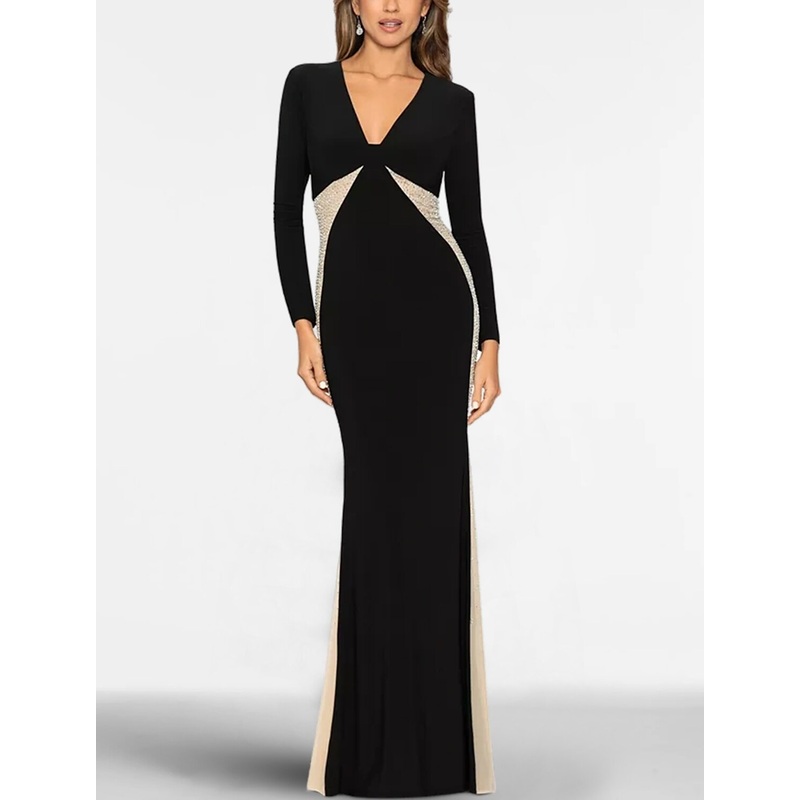 Mermaid Black Dress Plus Size Evening Gown Elegant Dress Formal Cocktail Party Floor Length Long Sleeve V Neck Fabric with Rhinestone