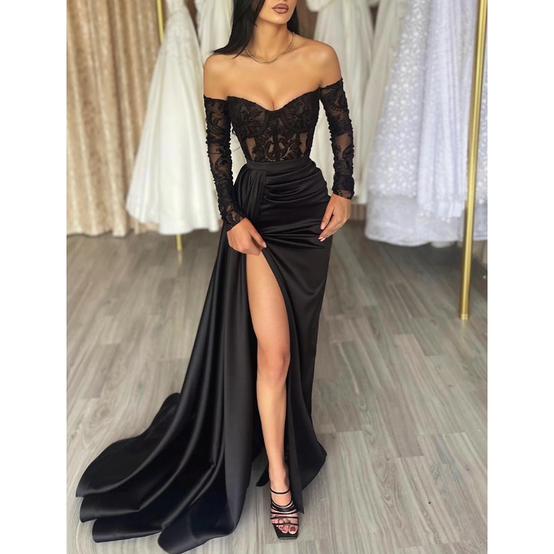 Mermaid Black Dress Plus Size Evening Gown See Through Dress Formal Masquerade Floor Length Long Sleeve Off Shoulder Fall Wedding Reception Satin with Appliques 2025