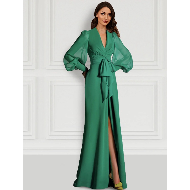 Mermaid Christmas Red Green Dress Evening Gown Elegant Dress Formal Wedding Guest Sweep / Brush Train Long Sleeve V Neck Fall Wedding Guest Chiffon with Slit Strappy