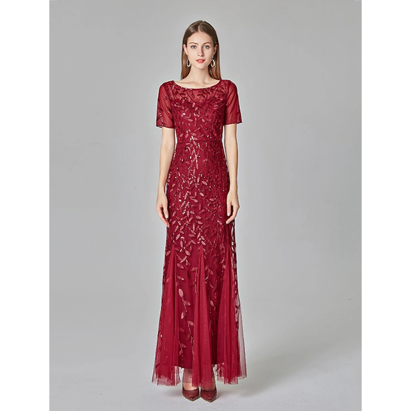 Mermaid Dress Evening Gown Empire Prom Formal Red Green Dress Floor Length Short Sleeve Jewel Neck Fall Wedding Guest Tulle with Embroidery