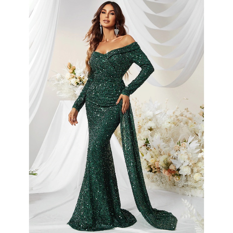 Mermaid Evening Gown Sparkle Christma Green Dress Formal Wedding Guest Sweep / Brush Train Long Sleeve Off Shoulder Polyester with Sequin