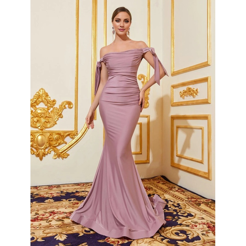 Mermaid off shoulder knot side fold front and floor length formal dresses