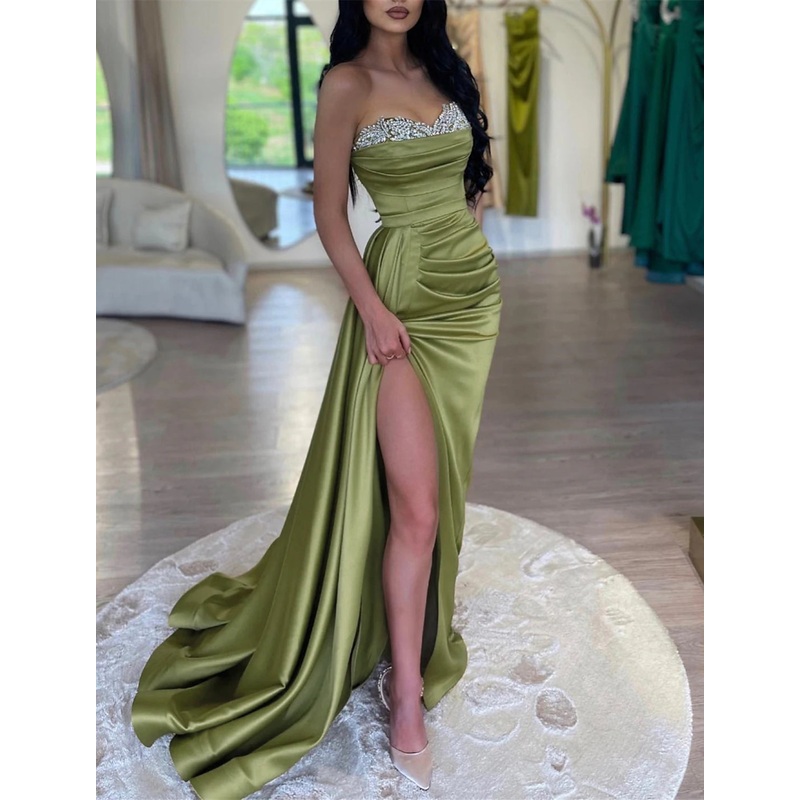 Mermaid Party Dress Evening Gown Sparkle & Shine Dress Formal Wedding Court Train Sleeveless Strapless Satin with Rhinestone Ruched Slit
