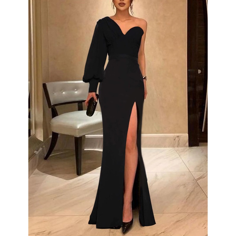Mermaid / Trumpet Evening Gown Black Dress Dress Wedding Guest Prom Floor Length Long Sleeve One Shoulder Fabric with Slit 2025