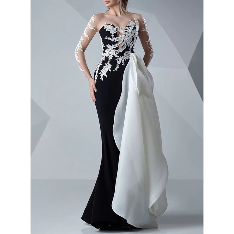 Mermaid / Trumpet Evening Gown Color Block Dress Formal Wedding Guest Floor Length Long Sleeve Jewel Neck Satin with Appliques