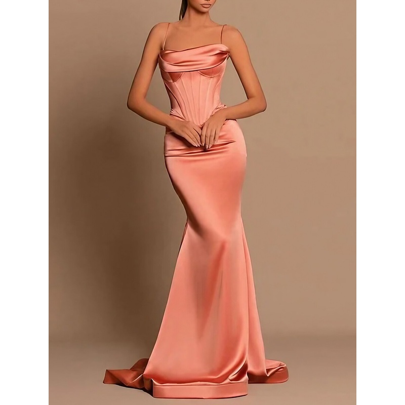 Mermaid / Trumpet Evening Gown Corsets Dress Wedding Cocktail Party Dress Sweep / Brush Train Sleeveless Spaghetti Strap Bridesmaid Dress Satin with Ruched