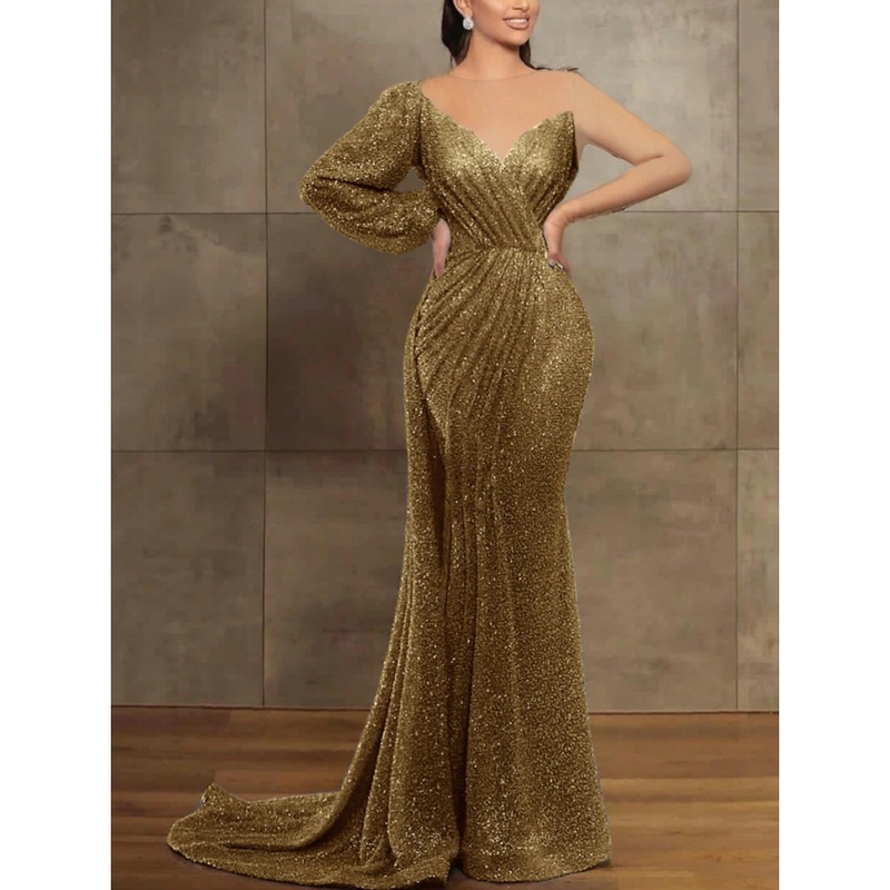 Mermaid / Trumpet Evening Gown Elegant Christmas Dress Formal Court Train Long Sleeve Illusion Neck Sequined with Pleats Sequin 2025