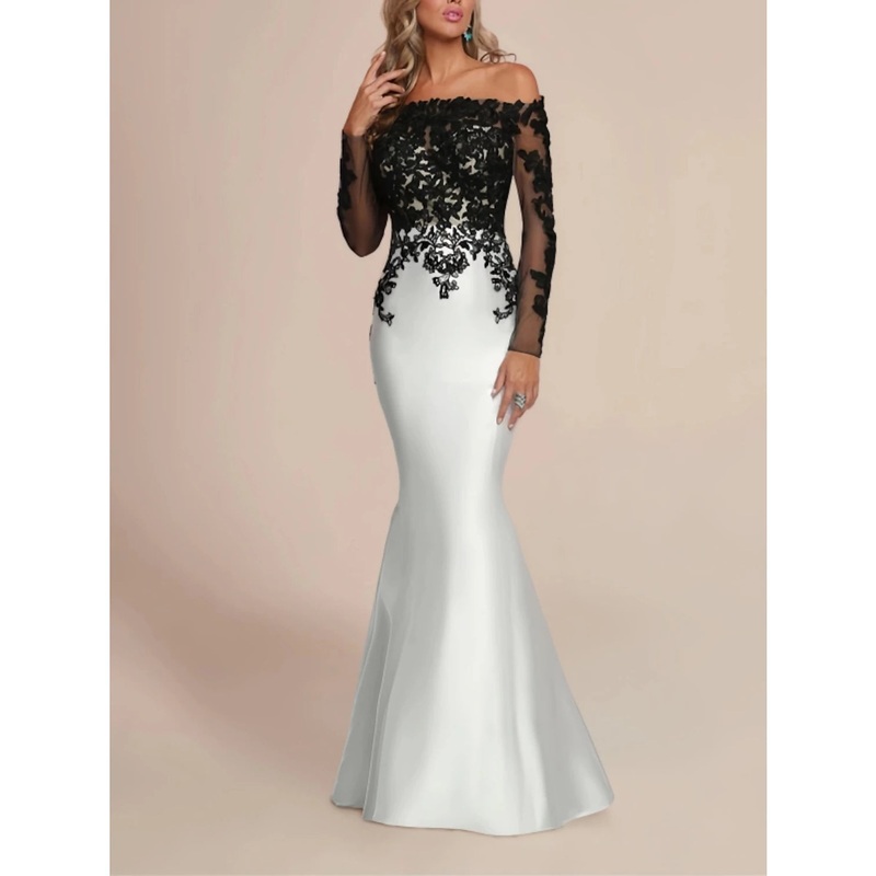 Mermaid / Trumpet Evening Gown Elegant Dress Formal Wedding Guest Floor Length Long Sleeve Off Shoulder Satin with Pleats Appliques