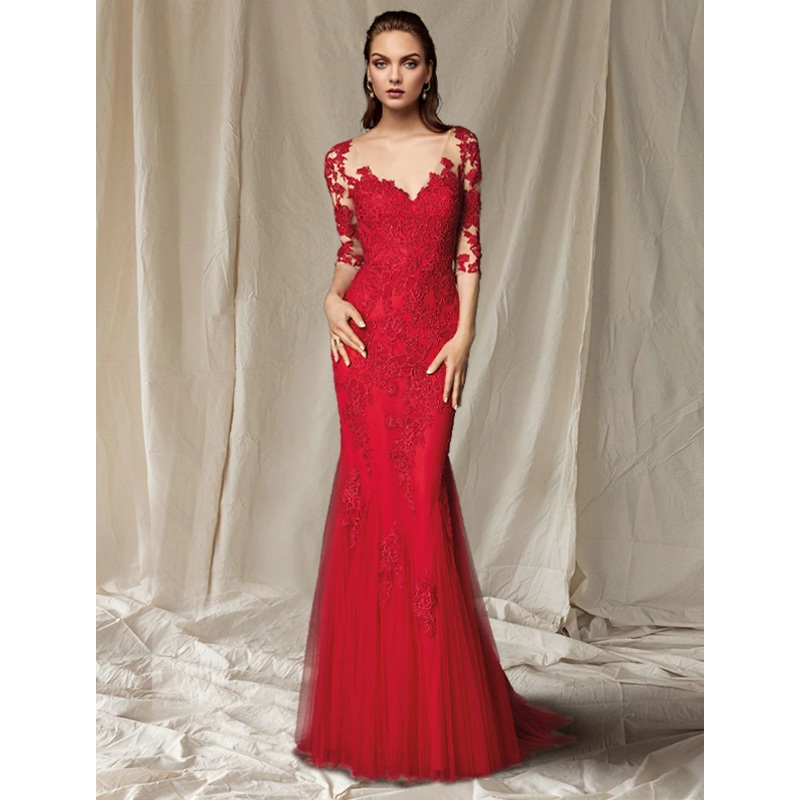 Mermaid / Trumpet Mother of the Bride Dress Luxurious Elegant V Neck Sweep / Brush Train Lace Tulle Half Sleeve with Pleats Appliques