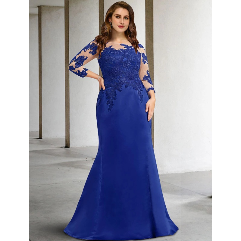 Mermaid / Trumpet Mother of the Bride Dress Plus Size Hide Belly Elegant Jewel Neck Floor Length Chiffon Lace 3/4 Length Sleeve No with Appliques