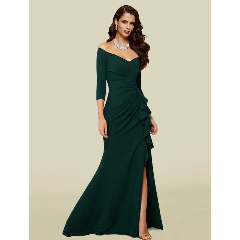 Mermaid / Trumpet Mother of the Bride Dress Wedding Guest Elegant Sexy Off Shoulder V Neck Court Train Fabric 3/4 Length Sleeve with Draping Split Front Fall