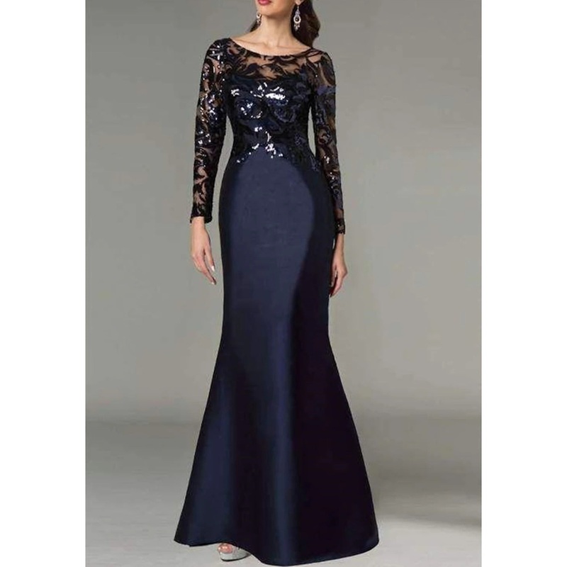 Mermaid / Trumpet Mother of the Bride Dress Wedding Guest Elegant Sparkle & Shine Jewel Neck Floor Length Satin Sequined Long Sleeve with Sequin Color Block