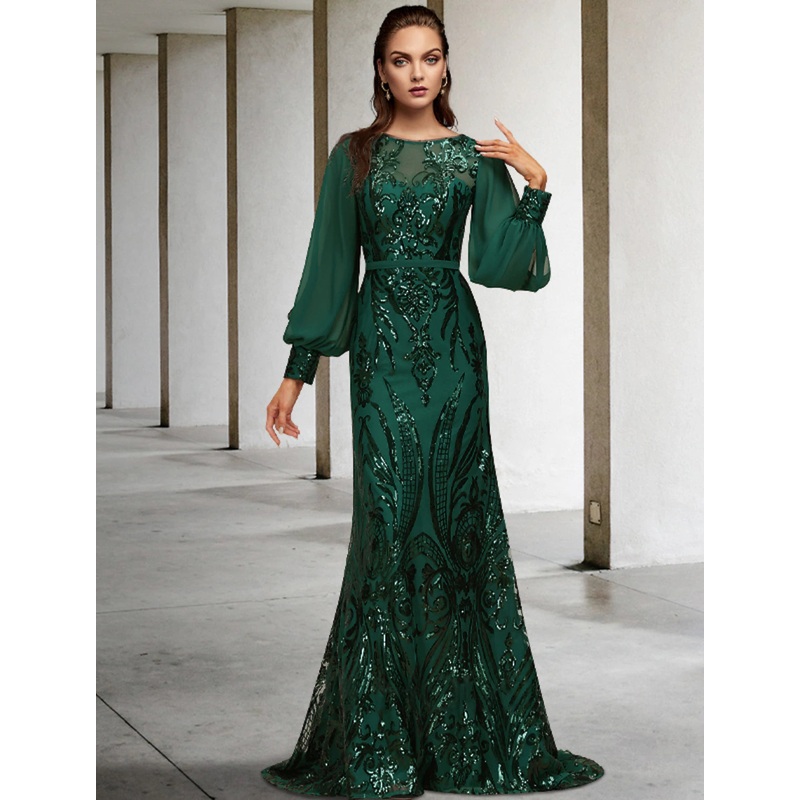 Mermaid / Trumpet Mother of the Bride Dress Wedding Guest Elegant Sparkle & Shine Jewel Neck Sweep / Brush Train Chiffon Sequined Long Sleeve with Sequin Appliques