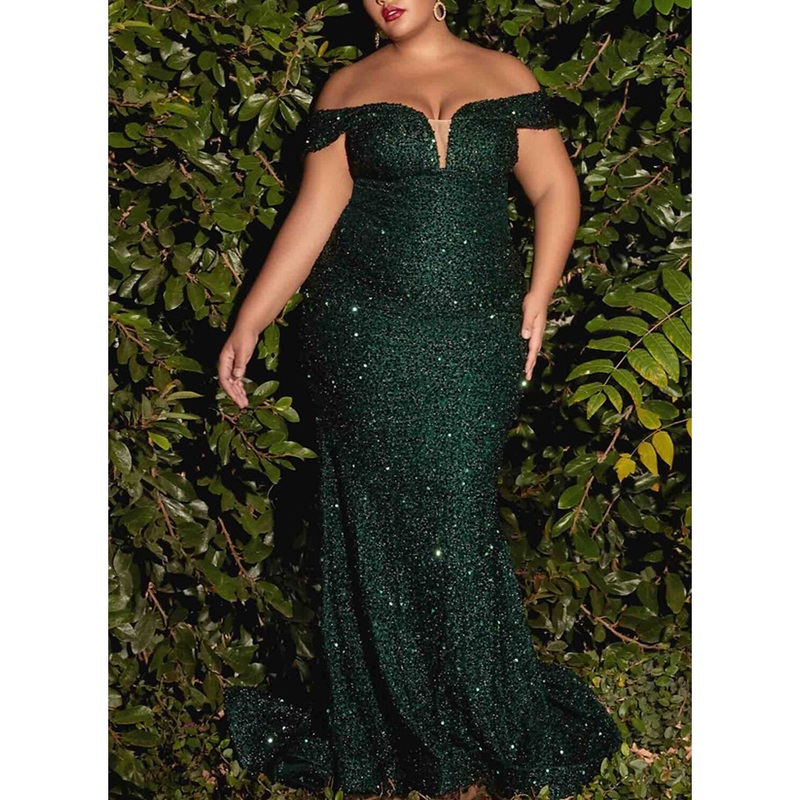 Mermaid / Trumpet Plus Size Curve Formal Dresses Plus Size Dress Formal Wedding Guest Chapel Train Sleeveless Off Shoulder Sequined with Sequin Pure Color