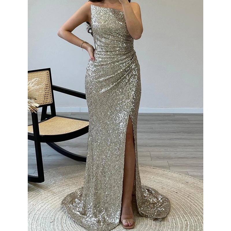 A-line/Princess strapless slit with glossy long prom dress