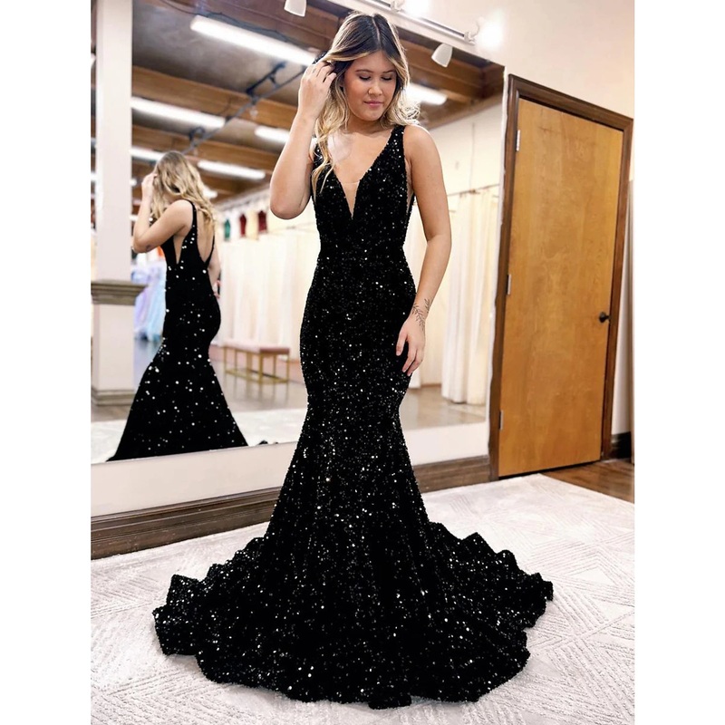 Mermaid / Trumpet Prom Dresses Sparkle & Shine Dress Formal Wedding Party Court Train Sleeveless V Neck Sequined Backless with Sequin