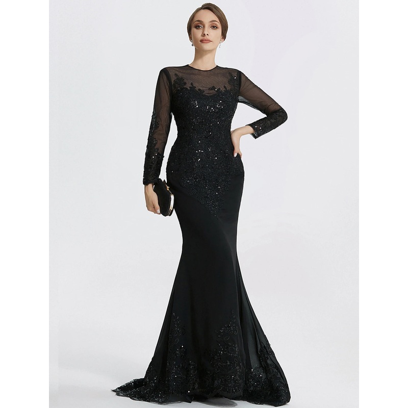 Mermaid / Trumpet Sheath / Column Evening Gown Elegant Dress Formal Floor Length Long Sleeve Jewel Neck Lace with Appliques