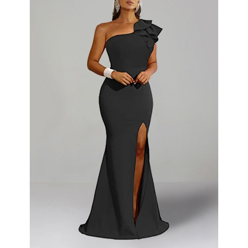 Mermaid / Trumpet Wedding Guest Dresses Maxi Dress Wedding Guest Wedding Party Sweep / Brush Train Short Sleeve One Shoulder Fabric with Ruffles Slit