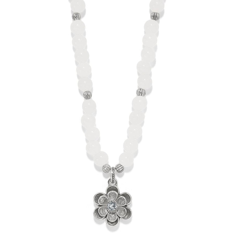 When our designer was in Bueno Aires, she saw a metal flower sculpture by the artist Eduardo Fernando Catalano and she loved the way the flowers had a scooped shape. That art inspired this beaded necklace with a silver double-stacked bloom and hand-hammered details.