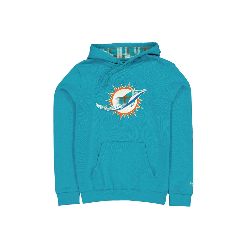 The Miami Dolphins 3rd Down Plaid Hoodie features a plaid applique Dolphins patch at the chest with a kangaroo pocket at the front and a plaid lined hood.