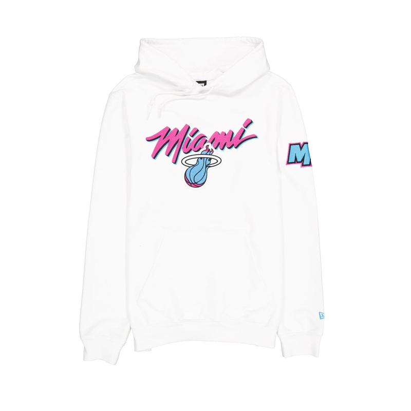 The Miami Heat 2024 City Edition White Hoodie features an embroidered Heat wordmark above a chenille applique team logo at the chest. Additional details include an alternate team patch at the left-wear sleeve, a kangaroo pocket at the front, and adjustable