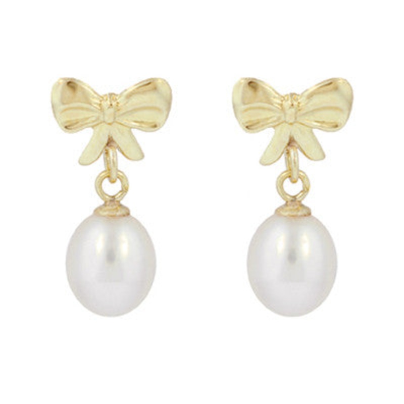 Elegant and romantic, these Mid-Century cultured pearl earrings are crafted in 14K yellow gold and feature a lustrous 6 millimeter oval shaped cultured pearl ( June Birthstone ) dangling from a graceful polished gold bow. These feminine 1950's design pearl