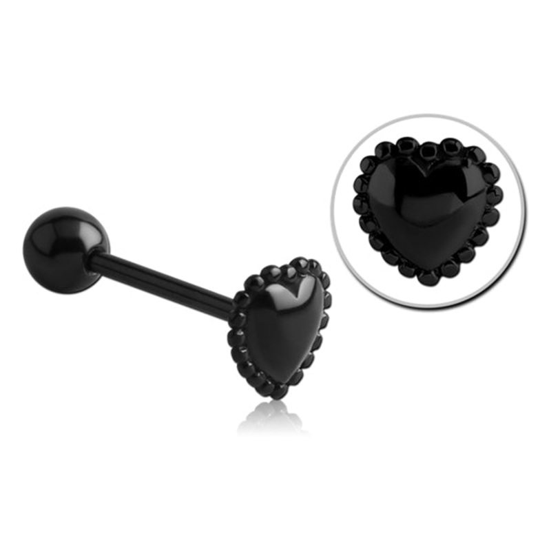 The 14 gauge milgrain heart tongue barbell is made from black PVD coated 316L stainless steel with external threading. The straight barbell is 5/8" long with a 6mm ball.