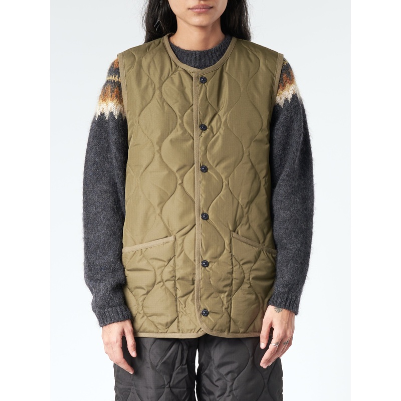 TAION crew neck down vest with a simple design accented with YKK metal snap buttons. The slits on both sides increases the range of motion.Crew neckYKK metal snap buttonsPatch pockets at the frontButtoned slits at the sides800 fill power downComes with a s