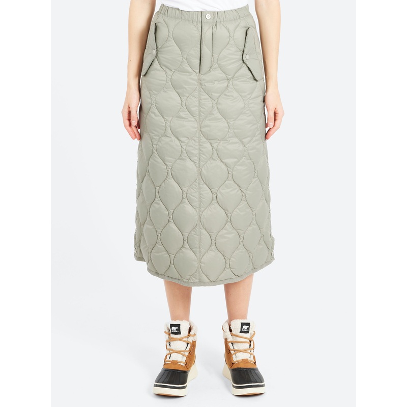 TAION semi-flared military down long skirt made with SOFT SHELL.The side slits allow for plenty of movement.Elasticated waistButton closure with zip flyFlap pockets at the front and backMetal snap buttoned slit at the sides800 fill power downComes with a s
