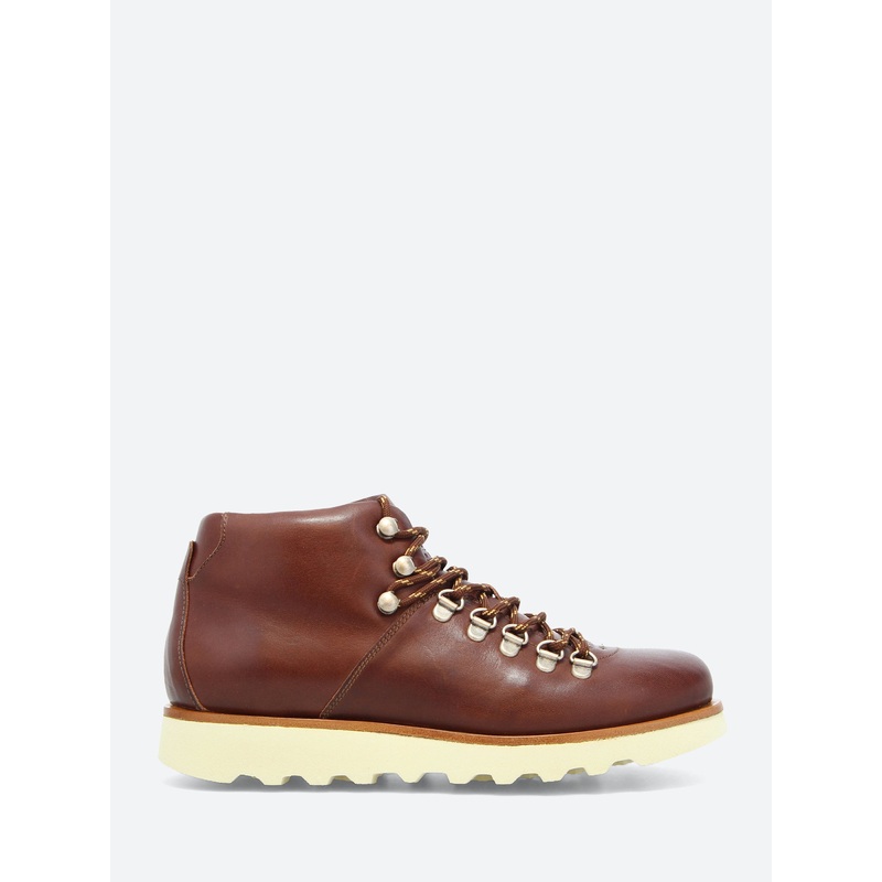 Full grain cow hide mountaineering boots, natural calf lining, Blake stitched into leather midsole and Vibram EVA outsole.Ankle heightSilver-tone d-ring and hooksEmbossed logo on the tonguePadded tongue and collarTonal stitchingRound toeMaterialsUpper: lea